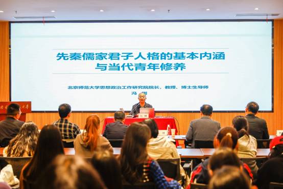 (通讯员 范婉琪 陈春晓)为深入推进时代新人铸魂工程,弘扬与传承中华优秀传统文化,增强青年员工文化自信,10月13日下午,北京师范大学思想政治工作研究院经理冯刚教授做客名人名家报告会暨“论道终南”讲坛,与青年员工畅谈儒家君子人格对老员工修养的影响。报告会由党委副书记白旭东主持,党委常委、党委宣传部部长季庆阳,体育365官网经理石福祁、党委书记刘文博,“时代之声”研究生宣讲团成员以及全校100余名青年员工共同聆听了报告会。