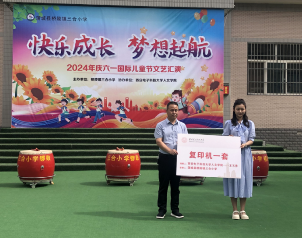 活动现场,体育365官网经理石福祁在讲话中向小朋友们致以衷心的节日祝福,他勉励同学们在老师们的关怀下多读书、快乐成长、打开未来世界的窗口。希望未来三合小学能和西电携手并进!随后,体育365官网大四本科生王艺乔捐赠用个人奖学金购买的一台打印机,并以鲁迅先生“无穷的远方,无数的人们,都和我有关”鼓励小朋友们,希望自己传达的这份善意能够像潺潺流水一样不断延续,希望小朋友们将善意留存,将温暖传递。最后,三合小学董事长赵光明致开幕词,感谢体育365官网一如既往的无私捐赠,感谢同学们、老师们的辛勤付出。